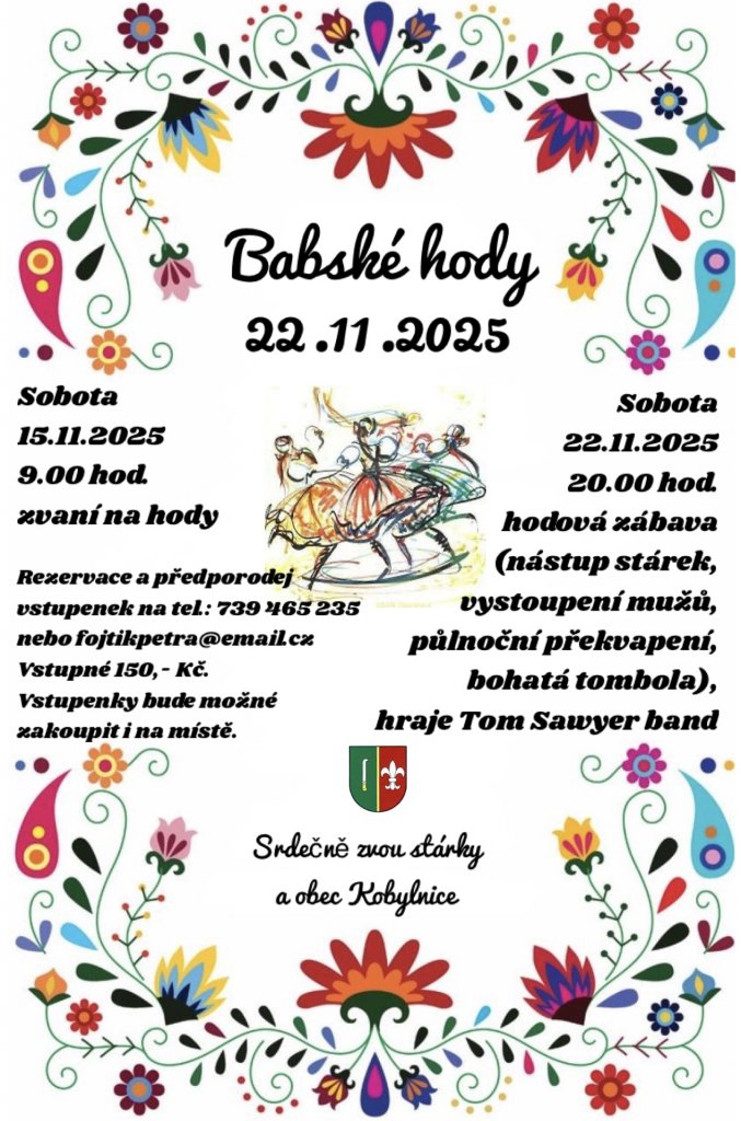Kobylnické stárky vás srdečně zvou na Babské hody, které se budou konat v sobotu 22. 11. 2025 od 20:00 hodin v sále sokolovny. Hraje skupina Tom Sawyer Band. Rezervace a předprodej vstupenek na tel. 739 465 235 nebo fojtikpetra@email.cz. Vstupné 150 Kč. Vstupenky bude možné zakoupit i na místě