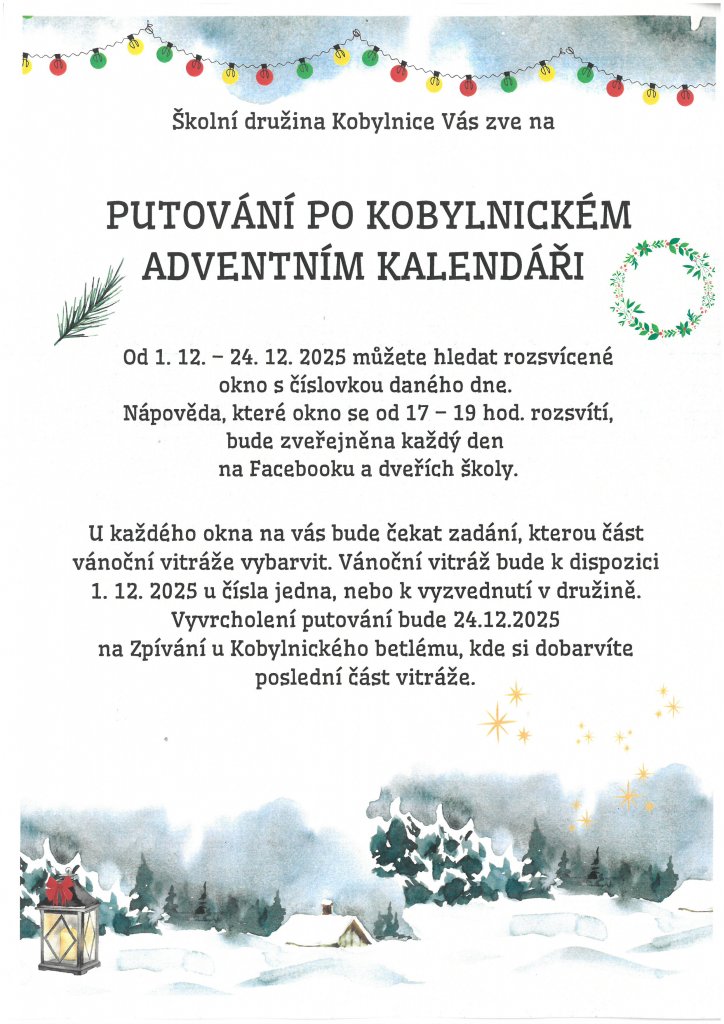 Školní družina Kobylnice Vás zve na Putování po kobylnickém adventním kalendáři. Od 1. 12. do 24. 12. 2025 můžete hledat rozsvícené okno s číslovkou daného dne. Nápověda, které okno se od 17 – 19 hod. rozsvítí, bude zveřejněna každý den na Facebooku a dveřích školy. U každého okna na vás bude čekat zadání, kterou část vánoční vitráže vybarvit. Vánoční vitráž bude k dispozici 1. 12. 2025 u čísla jedna, nebo k vyzvednutí v družině. Vyvrcholení putování bude 24.12.2025 na Zpívání u Kobylnického betléma, kde si dobarvíte poslední část vitráže.