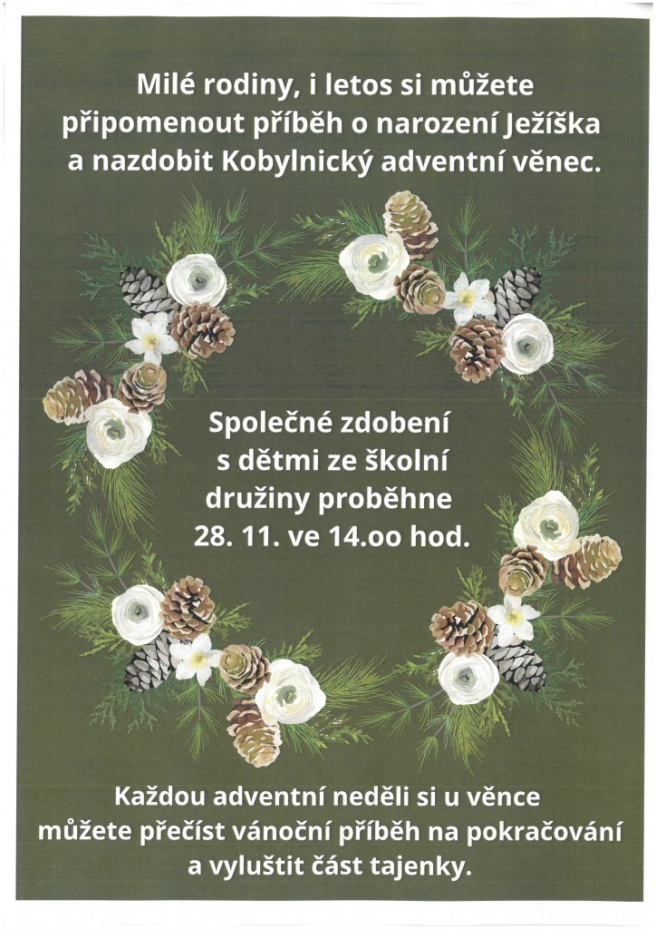 Milé rodiny, i letos si můžete připomenout příběh o narození Ježíška a nazdobit Kobylnický adventní věnec. Společné zdobení s dětmi ze školní družiny proběhne v pátek 28.11.2025 ve 14 hod. Kdo bude chtít, tak si může na věnec zavěsit vlastní ozdobu a zároveň si každou adventní neděli odnést část příběhu na pokračování a vyluštit část tajenky.