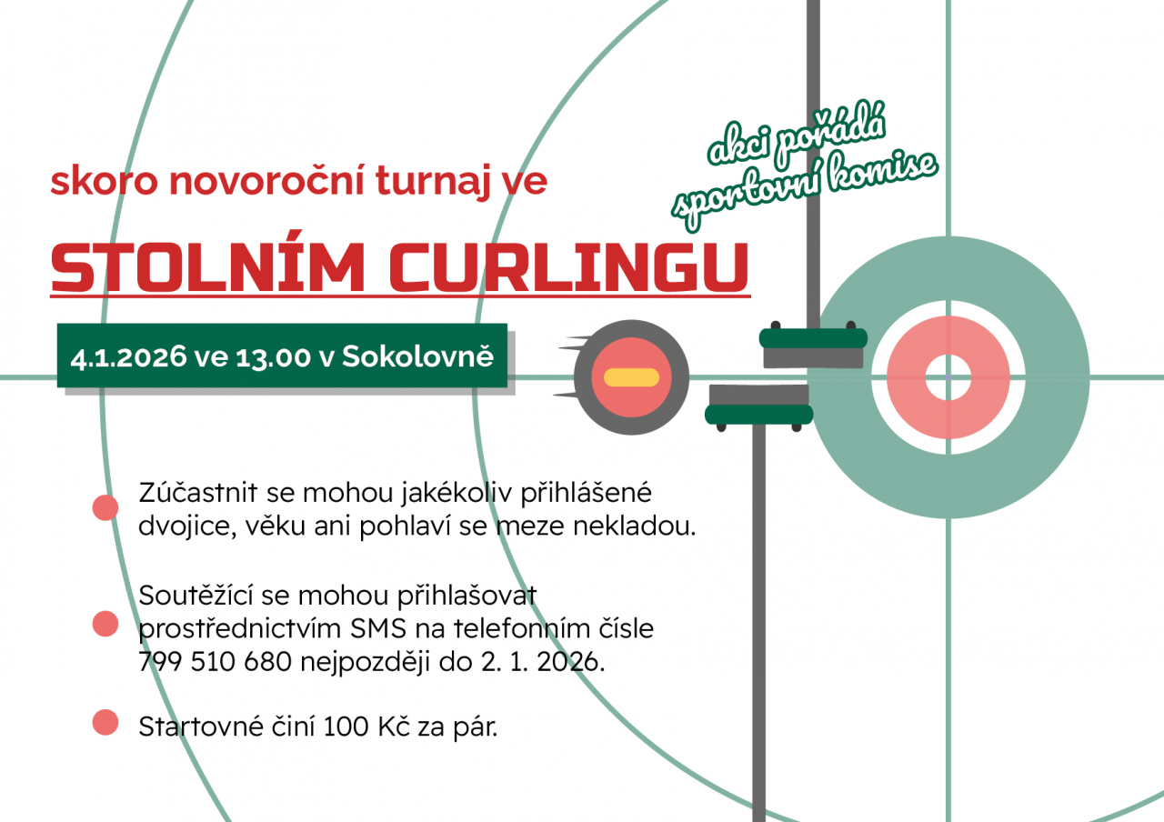 Sportovní komise pořádá turnaj ve stolním curlindu v neděli 4.1.2026 ve 13:00 hodin v sokolovně.