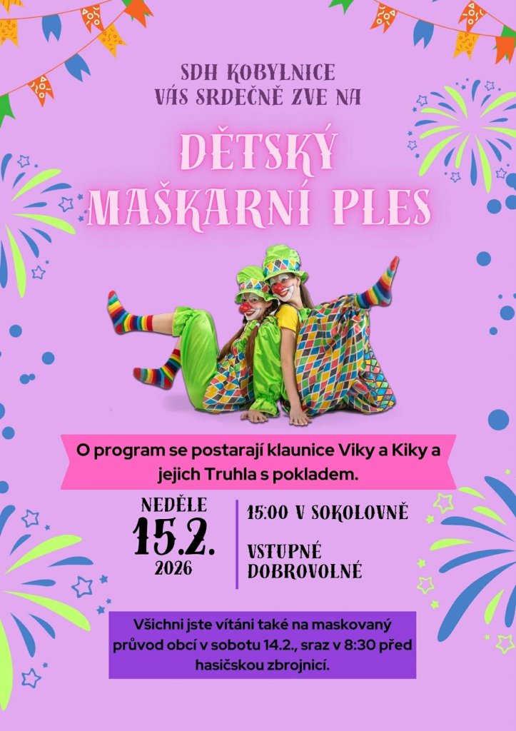 Dětský maškarní ples bude v neděli 15. 2.. v 15:00 v sokolovně.