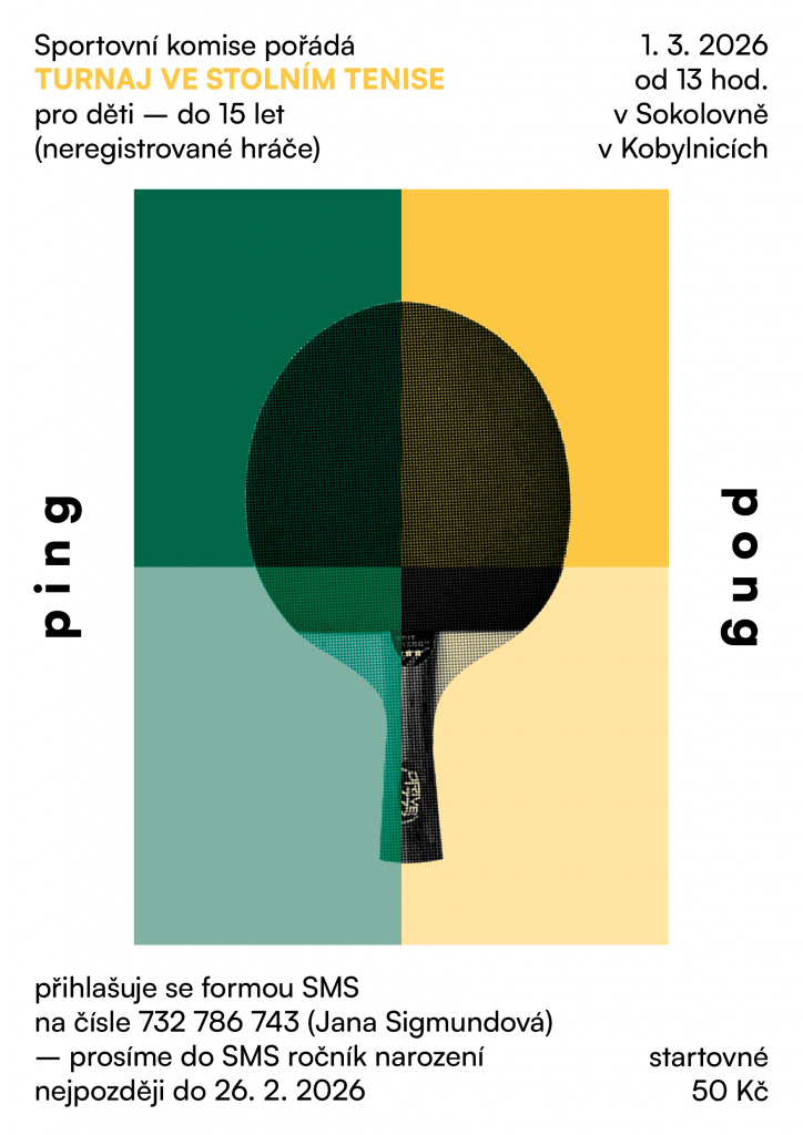 Sportovní komise obce Kobylnice pořádá v neděli 1.3.  ve 13:00 hodin v sokolovně turnaj ve stolním tenise pro děti do 15 let. Přihlašujte se formou SMS u Jany Sigmundové na telefonním čísle 732 786 743 a to nejpozději do 26.2. Startovné činí 50 Kč.
