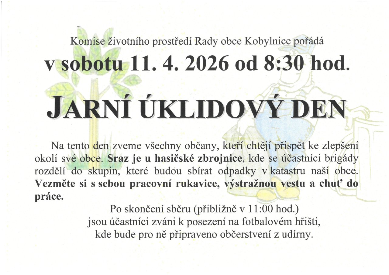 Komise životního prostředí pořádá v sobotu 11. dubna od 8:30 hod. jarní úklidový den. Na tento den zveme všechny občany, kteří chtějí přispět ke zlepšení okolí své obce. Sraz je u hasičské zbrojnice. Vezměte si s sebou pracovní rukavice, výstražnou vestu a chuť do práce. Po skončení sběru (přibližně v 11:00 hod.) bude pro účastníky připraveno občerstvení z udírny.